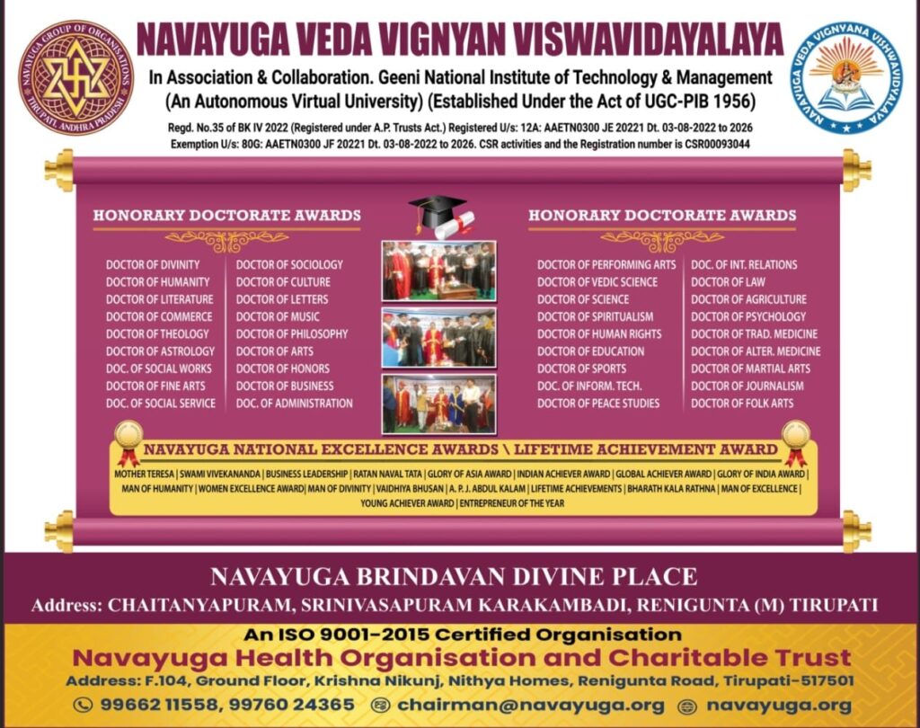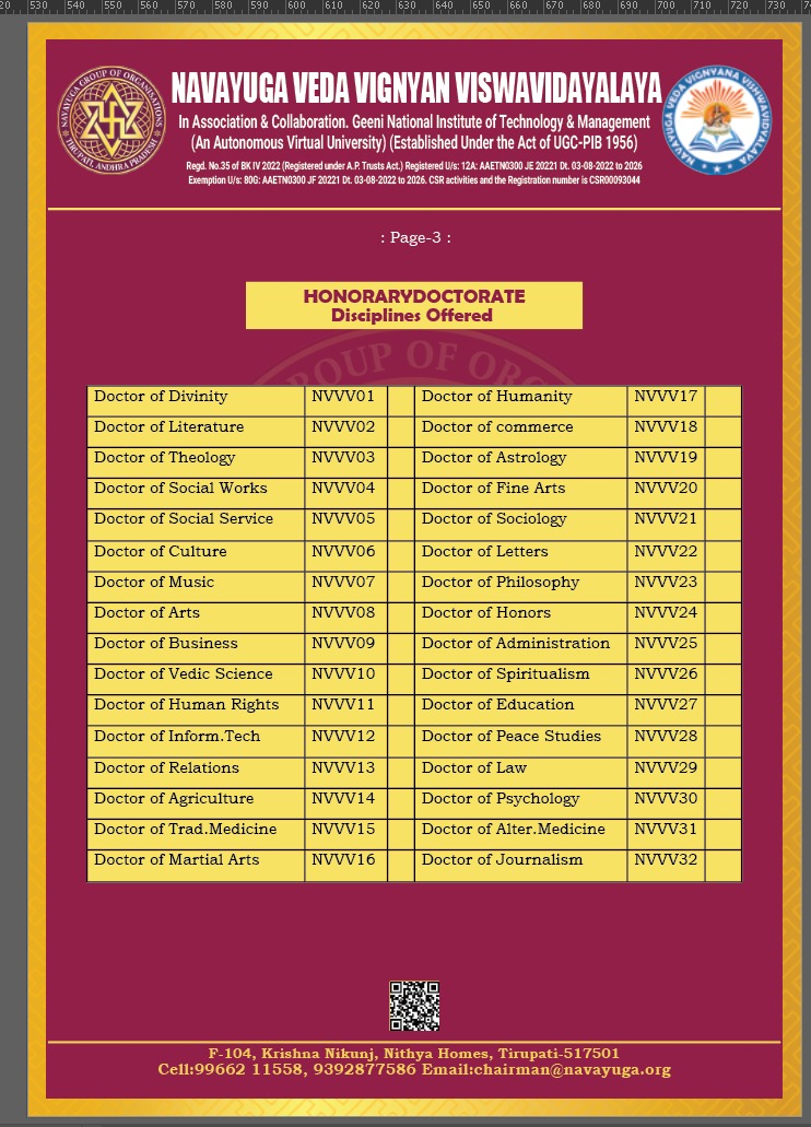 Bharath Virtual University for Peace & Education is purely an independent self-styled and autonomous private educational body, a unit of Non Government Organization named UNIVERSAL CARE FOUNDATION TRUST, which is registered with KA/2017/0164466 NITI-AAYOG Government of INDIA and the UNITED NATIONS ORGANIZATION Geneva. The BVU has been established by high ranking officials of Defence and Civil Service, after successfully completing their regular term of office in class one gazetted cadre, Government of India. The cause behind this nobel effort is to acknowledge, encourage and motivate people who are involved in various fields like social service, educaion, cultural and tradition of the country, sports, spiritual or divine activities, to provide higher education by imparting knowledge in their concerned fields and honour them by granting awards based on their exemplary contribuions with expertise in the field. Academic achievement have become a major concern for young adults looking forward to earning skill based professional degrees. With virtual education coming into existence, there is no longer a need for expensive travel to universities or tiring search for suitable universities to enroll or to review the curriculum. As career requirements and demnads increase in the modern world, there is a substantial section who do not prefer to spend 3 to 5 years or more to earn graduation in a physical campus. Therefore the virtual university offers hundreds of need based courses leading to tailor made Bachelor Degrees and Master Dergrees under credit/non-credit system that empower people to equip themselves with higher qualification to secure the desired job quickly and efficiently.